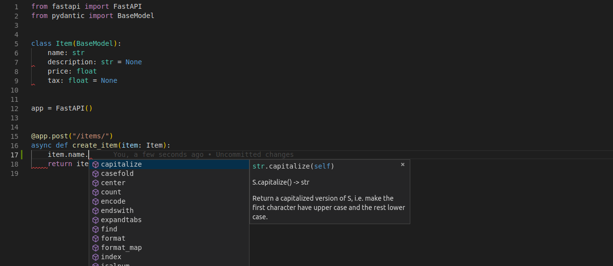 Item타입으로 선언했기 때문에, 모든 어트리뷰트와 그에 대한 타입에 대한 편집기 지원(완성 등)을 또한 받을 수 있습니다.